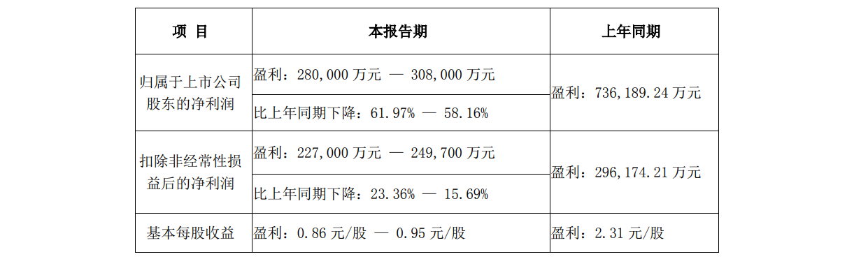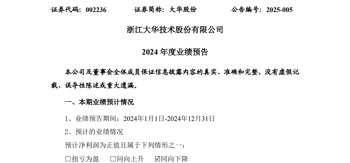 据公告,大华股份预计2024年度实现归母净利润将在28亿元至30.8亿元之间,同比降幅为61.97%至58.16%;扣除非经常性损益后的净利润预计为22.7亿元至24.97亿元,同比下降23.36%至15.69%。