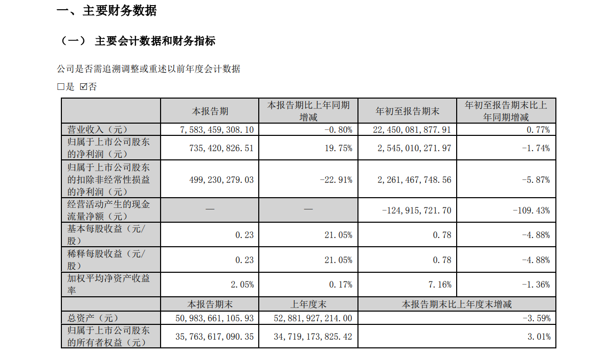 大华股份2024年10月26日发布的三季报显示,前三季度公司实现营收224.5亿元,同比增长0.77%;实现归母净利润25.45亿元,同比下滑1.74%;实现扣非归母净利润22.61亿元,同比下滑5.87%。单三季度看,实现营收75.83亿元,同比小幅下滑0.8%,实现归母净利润7.35亿元,同比增长19.75%。